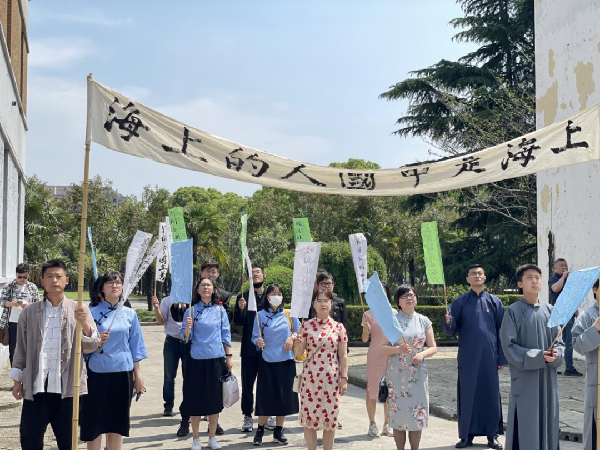 在这堂生动的电影党课上,大家被引导着换上具有年代特征的服装,搭乘“初心号”红色巴士穿行在“老上海”。沿着“红色光影”的传奇足迹,这辆巴士在具有不同时代印记的红色影视建筑和场景中带着穿行者感知过往的激荡岁月。