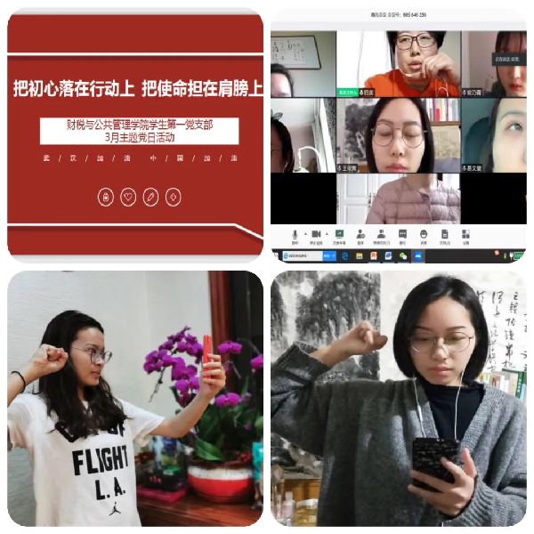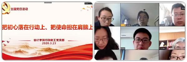 会计学院党委下设5个教师党支部,7个学生党支部,按照主题党日活动要求,利用线上平台,包括腾讯会议、企业微信等APP,开展主题党日活动。在学习了习近平总书记关于疫情防控工作重要讲话和指示精神之后,每位党员都撰写了学习体会。同时,各支部也结合自身情况,挖掘典型,用身边鲜活的事迹作为教育素材,号召向身边人学习,取得良好效果。