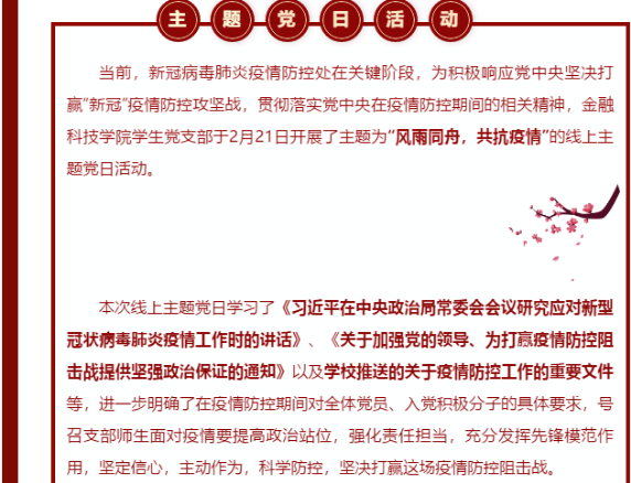 金融科技学院学生党支部围绕学习贯彻落实习近平总书记对新冠肺炎疫情防控的重要讲话精神,先后开展“风雨同舟、共抗疫情”等多次线上主题党日学习活动,号召师生面对疫情要提高政治站位,强化责任担当。
