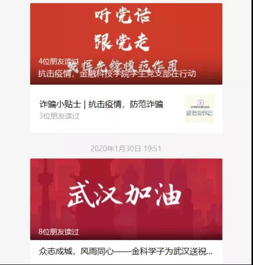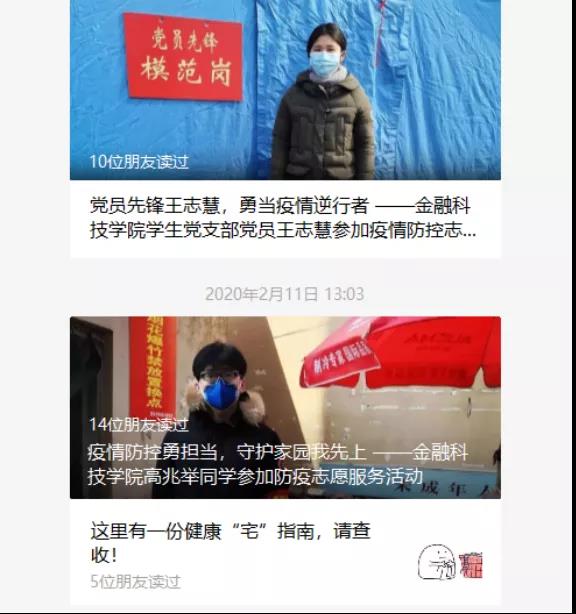 学生党支部从1月21日起,开展学生健康每日排摸工作,支部党员主动联系经济困难、心理困难等重点人群,并通过学院微信公众号向全院师生宣传疫情防控知识,共推送“抗击疫情,金融科技学院学生党支部在行动”、“金融科技学院学生党支部团结一心共'战疫'”、“线上学雷锋,线下当雷锋”主题党日活动等22篇疫情相关文章。通过手写、视频、论文等形式为武汉送祝福。