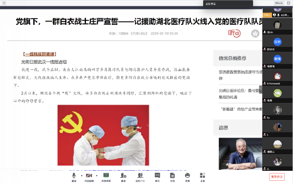 为深入贯彻落实习近平总书记关于打赢疫情防控阻击战重要指示精神,引导学生从中国的“战疫”实践中深化对中国共产党和中国特色社会主义的认识,不断坚定“四个自信”,做到“两个维护”,财税与公共管理学院青年马克思主义研究分会于近期开展第二次党章学习小组活动,组织学员围绕疫情防控阻击战深入学习习近平总书记相关重要讲话精神。