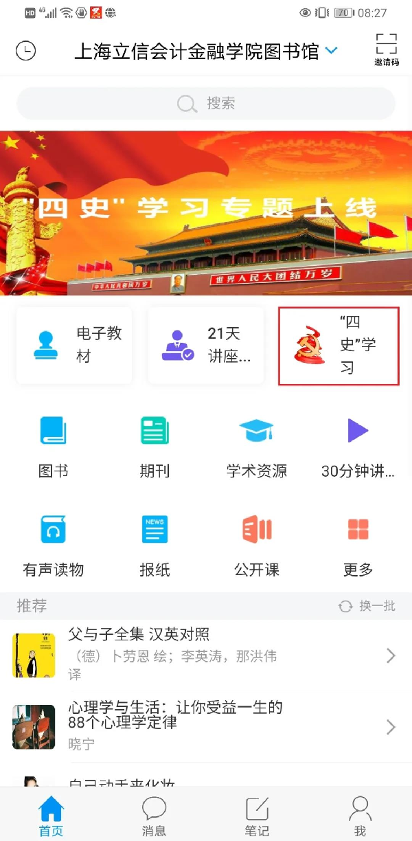 为深入贯彻习近平总书记关于学习“四史”的重要论述,全面落实习近平总书记考察上海重要讲话精神,按照学校《关于开展党史、新中国史、改革开放史、社会主义发展史学习教育的实施方案》等文件要求,切实助力我校的“四史”学习教育,近日,图书馆把“四史”学习教育作为一项重要政治任务来落实,多部门联动推出了组合拳,在三校区图书馆分别设立了“四史”学习教育专题展示书架;推出了“四史”馆藏书单;联合超星在“学习通-上海立信会计金融学院图书馆”APP上开辟了“四史”电子专题书,便捷师生学习借阅。