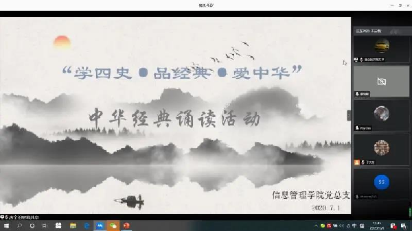 七月一日晚,为庆祝建党99周年,信息管理学院党总支利用这一重要节点开展了“四史”专题学习,举办了师生党员“学四史•品经典•爱中华”经典诵读线上活动。来自8个支部近四十位党员代表出席了活动。
