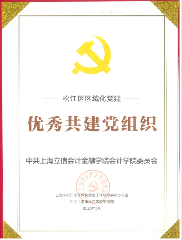 近日,松江区召开区域化党建工作联席会议,命名了40家松江区区域化党建优秀共建党组织, 发布了“区域高校赋能基层治理”项目,我校会计学院党委荣获松江区区域化党建“优秀共建党组织”称号。
