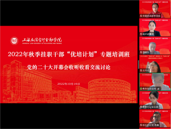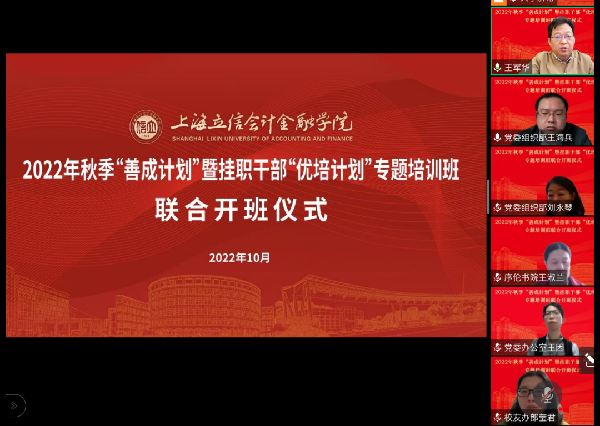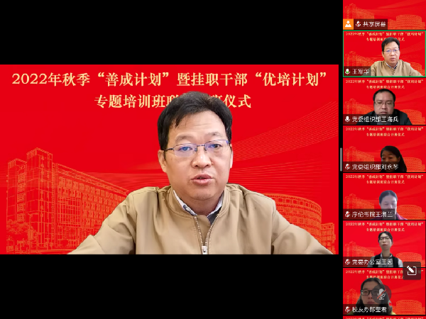 10月16日,在中国共产党第二十次全国代表大会胜利开幕之际,我校举行2022年秋季“善成计划”暨挂职干部“优培计划”专题培训班线上联合开班仪式。党委副书记、副院长王军华,党委常委、党委组织部部长刘永琴,全体主持工作副职干部以及2022年全体挂职干部参加开班仪式。开班仪式由党委组织部副部长王海兵主持。