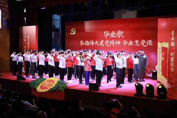 赵荣善带领新党员进行入党宣誓,带领毕业生党员代表、党课参演师生党员代表一起重温了入党誓词。