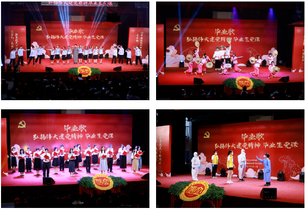 毕业生党课由国际经贸学院近百名师生共同演绎,主要分为歌演《毕业歌》弘扬伟大建党精神、舞秀《游击队歌》弘扬抗日战争精神、舞蹈《南泥湾》弘扬延安精神、情景朗诵《鸭绿江的呼唤:谁是最可爱的人》弘扬抗美援朝精神、配乐朗诵《改革开放四十年的启示》弘扬改革开放精神、情景剧《抗疫有我》弘扬抗疫精神和《李建模与黄文秀:穿越时空的对话》弘扬脱贫攻坚精神等6个主要节段组成。毕业生党课在全场师生挥舞五星红旗、高唱《歌唱祖国》中圆满结束。